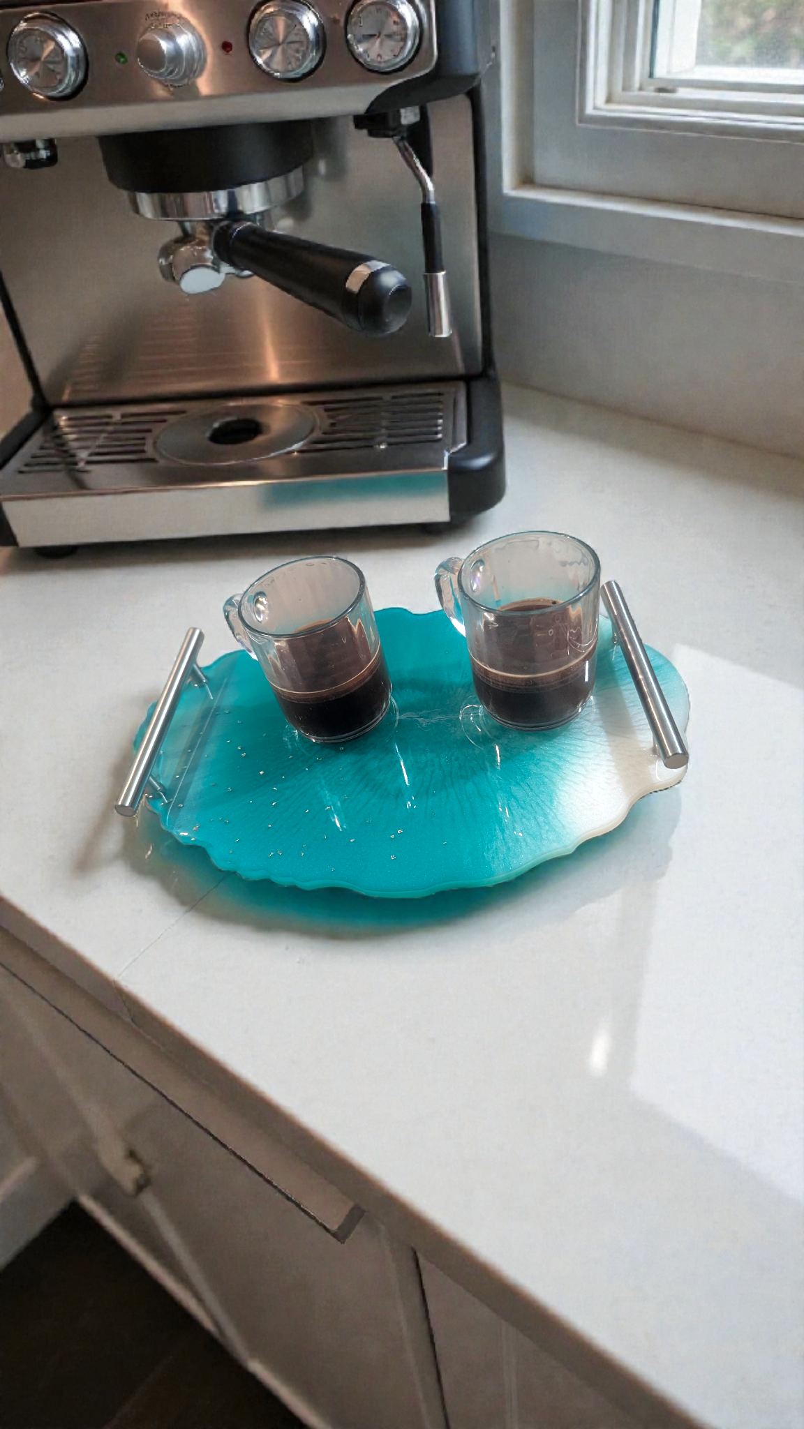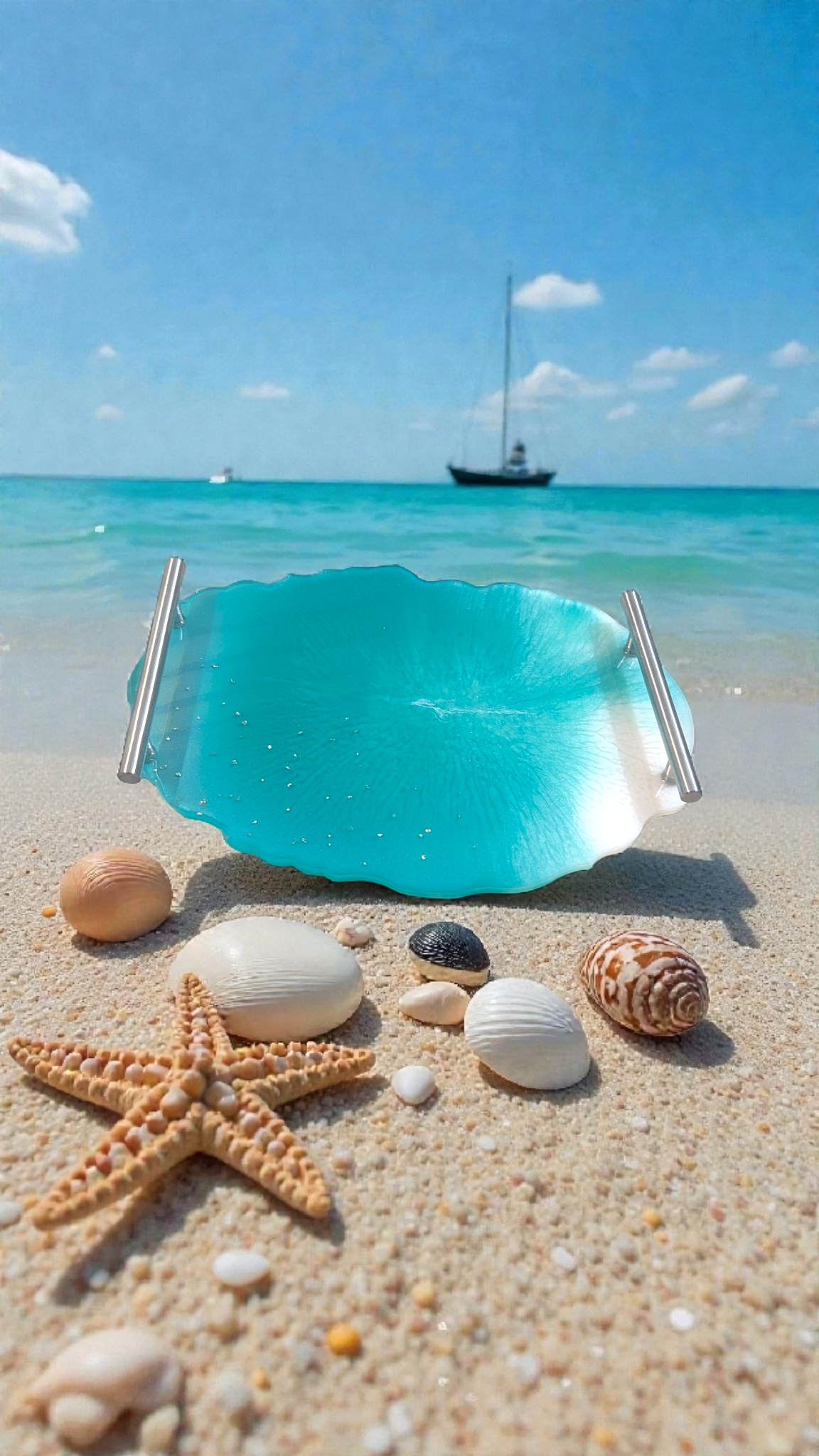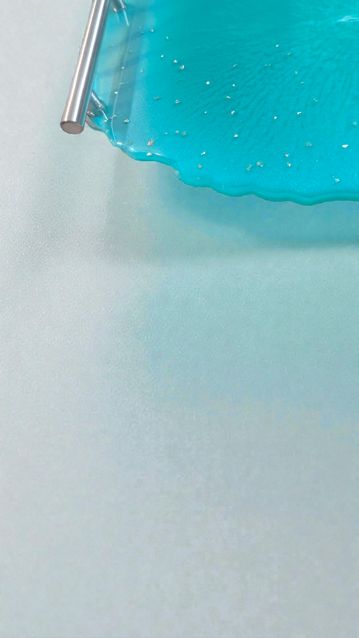 Apportez une touche d’élégance à votre intérieur avec ce plateau géode en résine époxy, entièrement réalisé à la main. Ses nuances vert turquoise évoquent les eaux cristallines des lagons, tandis que les strass argentés offrent une brillance subtile et raffinée sur l’un des côtés.