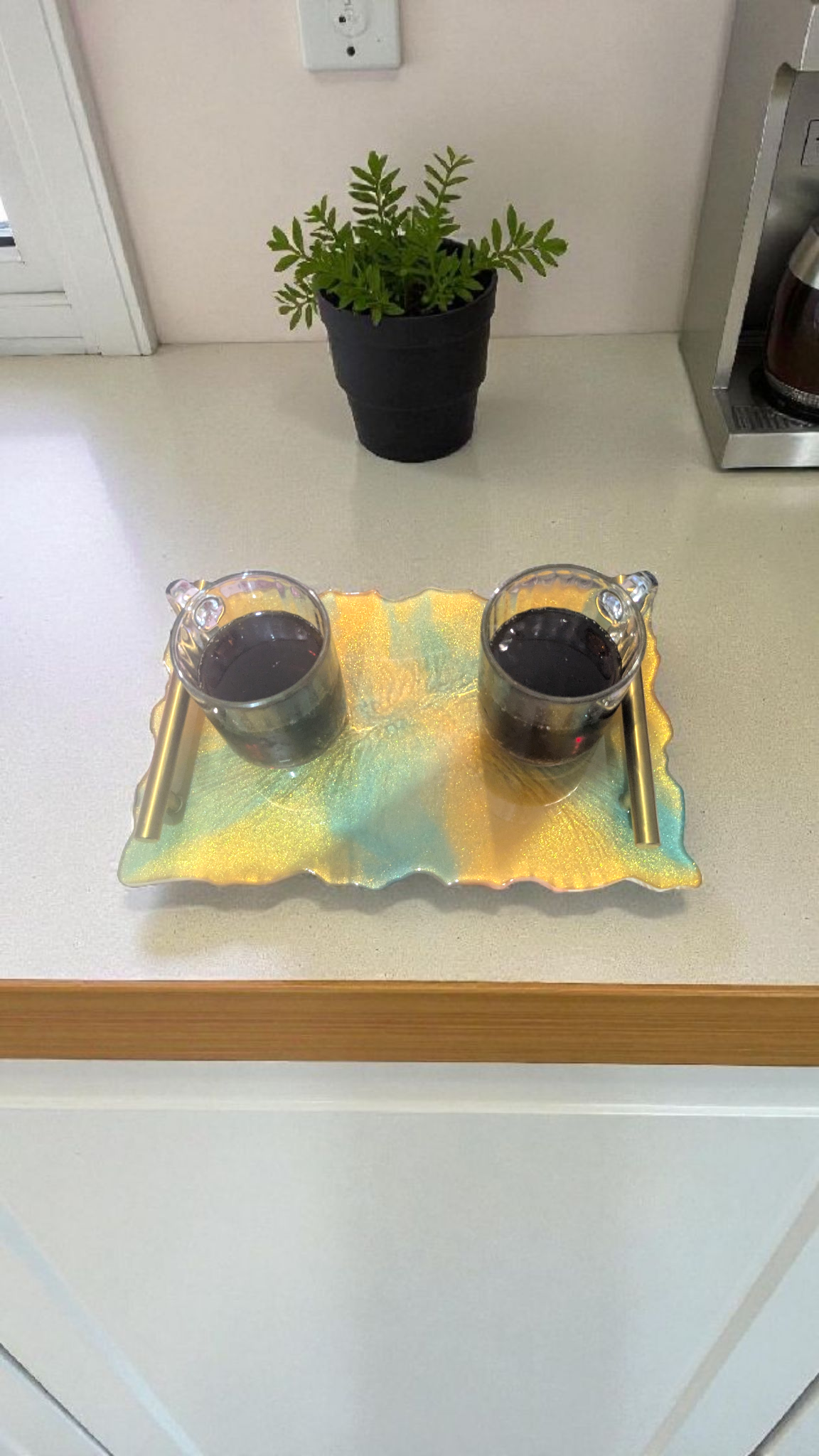 Plateau en résine époxy fait main, aux reflets irisés qui changent selon la lumière.