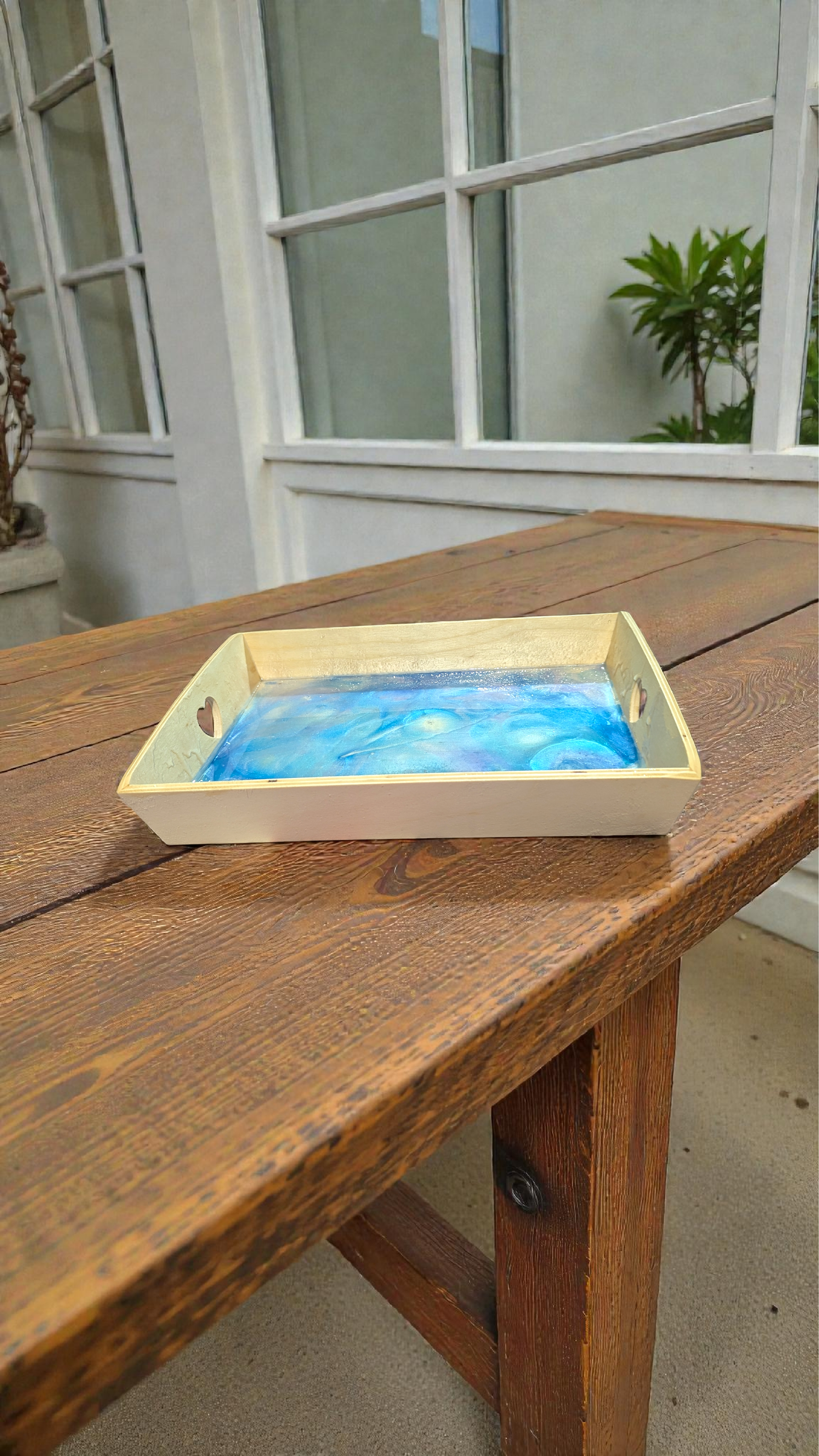 Ses nuances de bleu profond, turquoise et nacré rappellent les reflets changeants de la mer, comme une vague figée dans le temps. La résine, travaillée à la main, crée des mouvements organiques et lumineux, rendant chaque plateau absolument unique.
