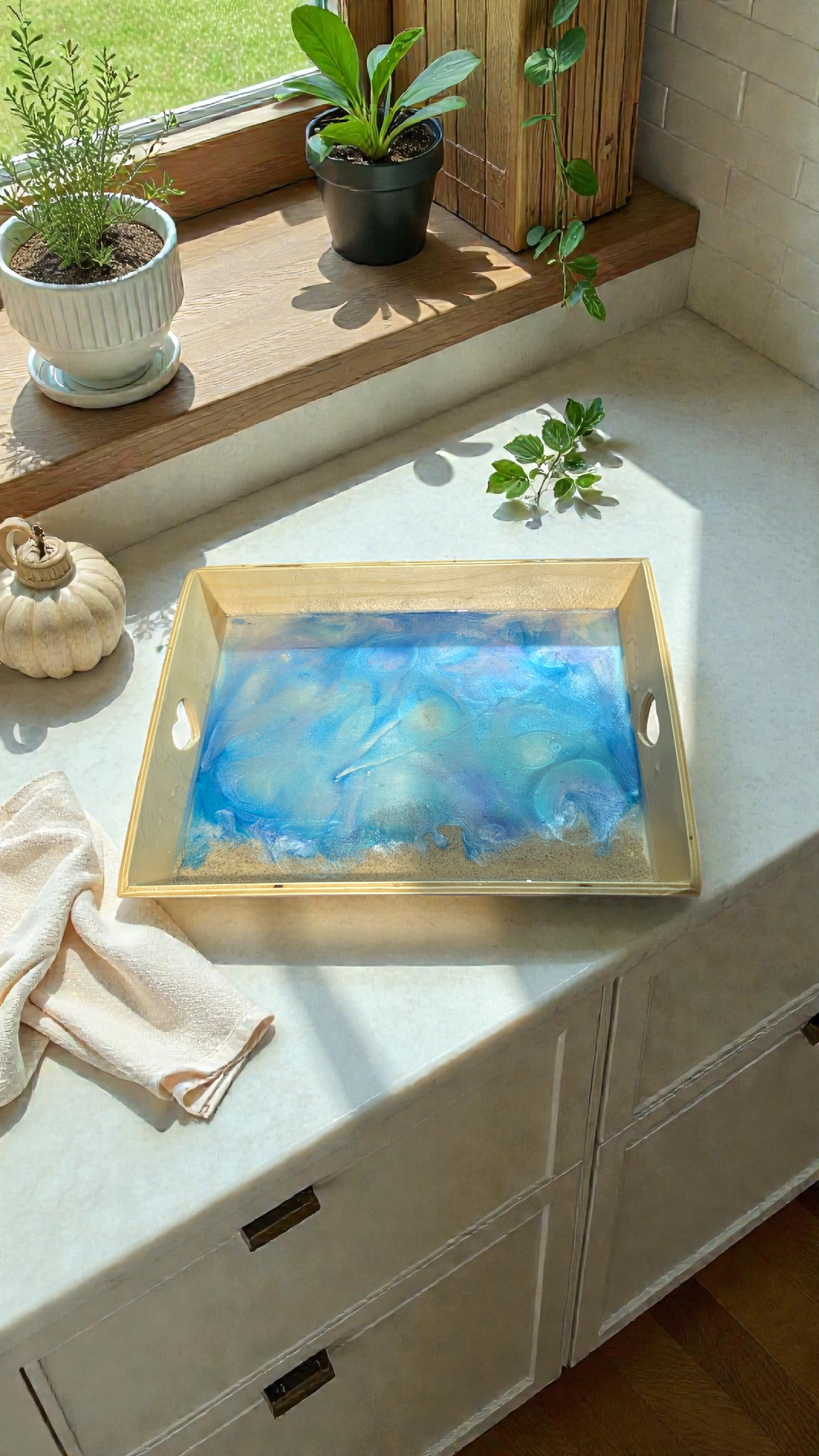 Dégradé de bleu, rappellant l’ocean et son sable fin.Pensé autant comme objet décoratif que plateau fonctionnel, il trouvera parfaitement sa place dans une cuisine, un salon ou même comme plateau de service élégant.