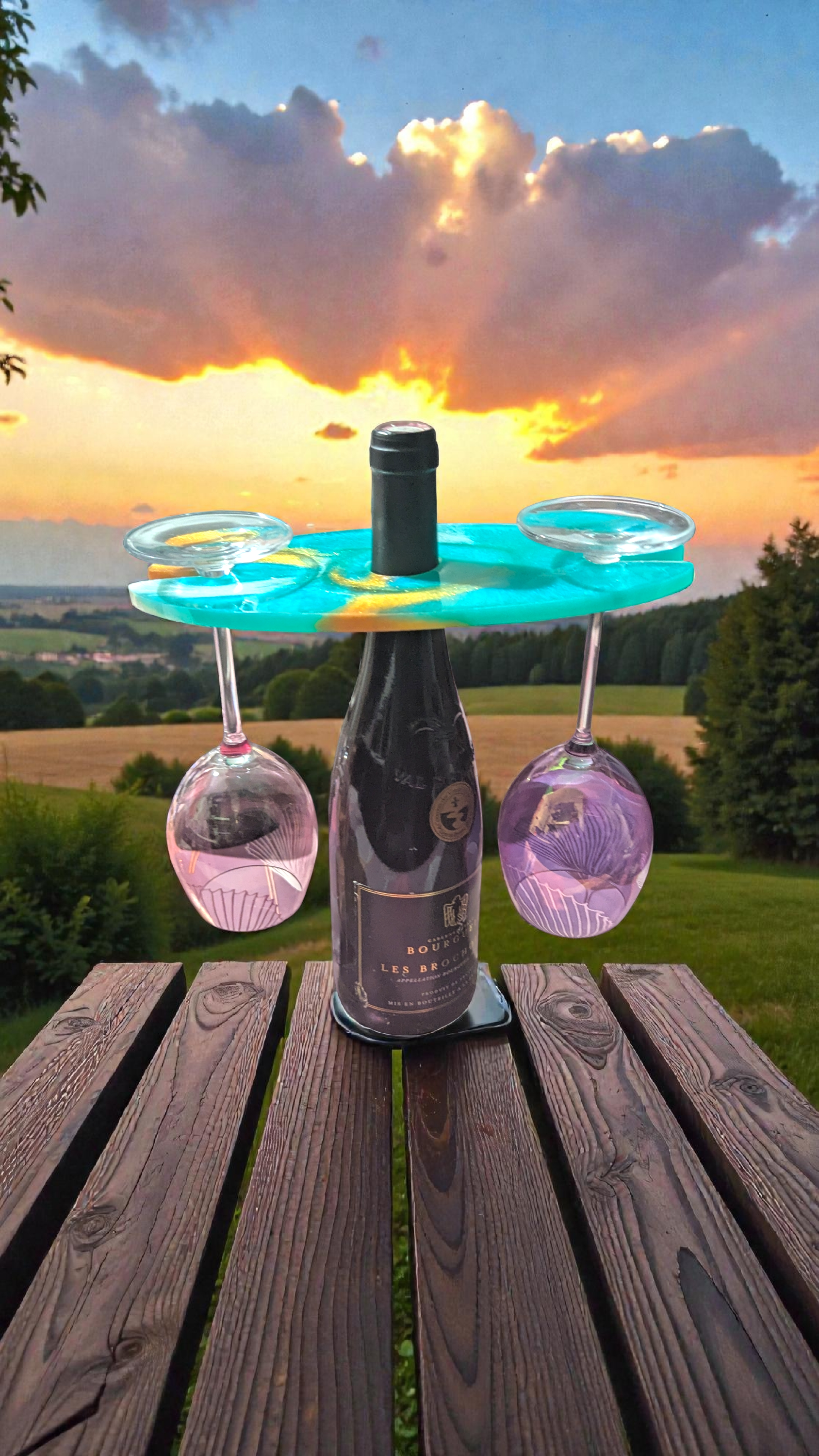 Entièrement réalisé à la main, ce support accueille une bouteille ainsi que des verres suspendus, créant un ensemble harmonieux et spectaculaire. La résine époxy, brillante et résistante, capte la lumière et révèle des nuances profondes et vibrantes.