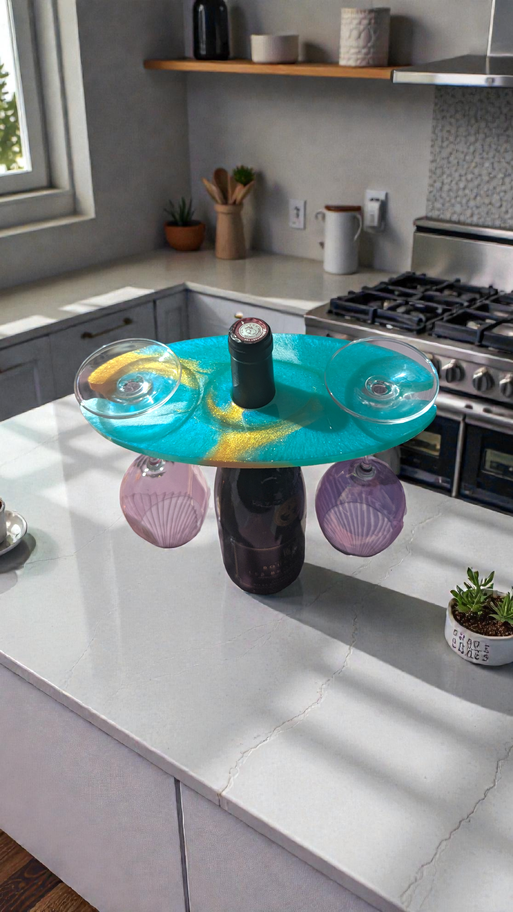 Support bouteille en résine époxy au design courbé et aérien, mêlant turquoise lumineux et touches dorées.